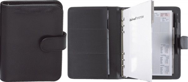 Hochwertiger Ringbuch Kalender aus Soft - Nappalederimitat, ausgestattet mit: Kalender 1 Woche = 2 Seiten, 3-sprachig D/E/F, drei Visitenkartenfächern, Schreibgeräteschlaufe und Druckknopfverschluss.
