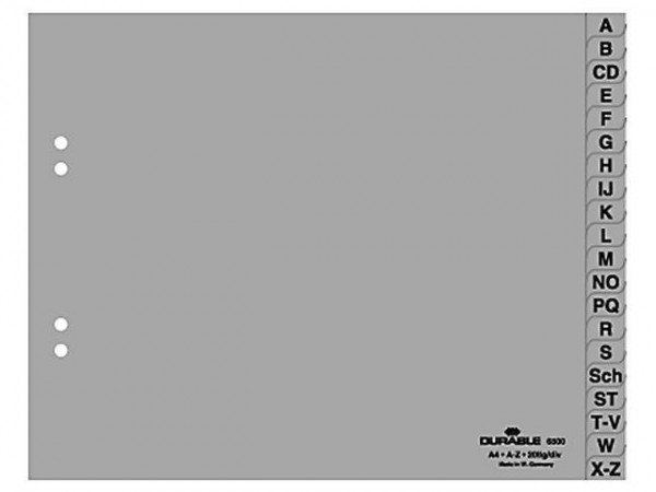 DURABLE Register aus Kunststoff. Lochung: 60/80 mm mit geprägter Tabe. Ausführung der Tabe: A - Z. Farbe: grau. Verwendung für Papierformate: DIN A4 teildeckend. Größe (B x H): 215/230 x 180 mm. Anzahl der Blätter: 20 Stück.
