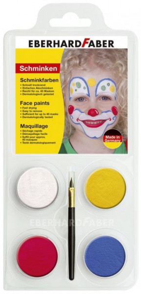 Mit den Schminkfarben auf Puderbasis und den holzgefassten Schminkstiften sind der Motivauswahl für die nächste Party keine Grenzen gesetzt! Die ergiebigen Farben auf Puderbasis lassen sich leicht mischen, trocknen schnell und verwischen nicht. Die Schminkstifte sind ideal für feine Konturen und flächige Motive. Wenn die Party vorbei ist, lassen sich die bunten Masken mit Wasser und Seife ganz einfach wieder abwaschen. Alle Farben sind dermatologisch getestet und bestens hautverträglich. Die Farben werden nach der EU-Kosmetikrichtlinie hergestellt. Schminkfarben-Sets in Profi-Qualität: Inklusive Pinsel, Schwämmchen und detaillierte Schminkanleitung, sehr gut deckend, einfach anzuwenden und feucht aufzutragen, Wasserlöslich, sehr gut mischbar Schnell trocknend, besonders wischfest, einfaches Abschminken, auch für Bodypainting geeignet. Reicht bis zu 40 Masken. In verschiedenen Setgrößen und Farbsortierungen erhältlich. Clown Set mit 4 Farben: weiß, gelb, rot, blau