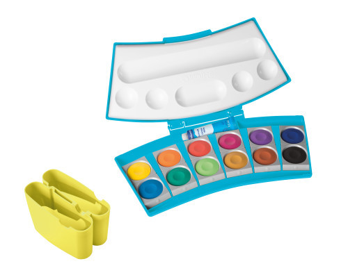 Pelikan ProColor Farbkasten in türkis/gelb mit 12 hochwertigen Farben und zwei abnehmbaren Wasserboxen. Herausnehmbare Mischpalette mit tiefen Mischfeldern. Inklusive Deckweiß, Wasserbox & Mischpalette