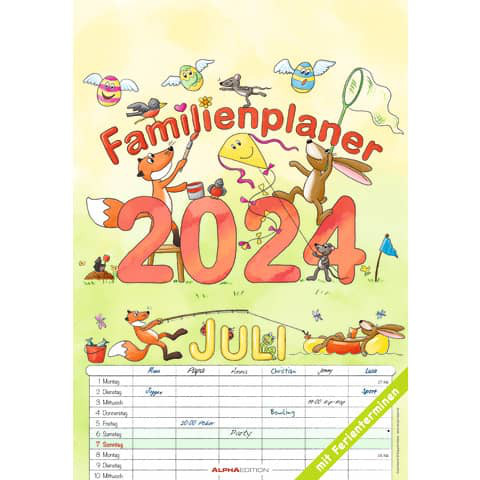 Der mit lustigen Cartoons illustrierte Familienplaner mit sechs Spalten lässt Sie keinen Termin Ihrer Familie mehr vergessen. Der Familienplaner hat die Maße 23,7 x 34 cm und enthält zusätzlich eine Übersicht über Ferientermine.